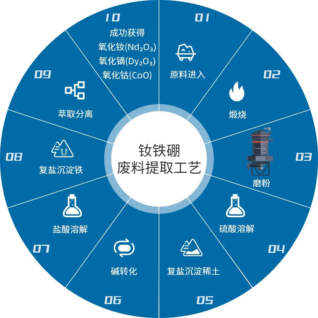 釹鐵硼的主要構(gòu)成元素包含稀土元素釹(Nd)、鐵(Fe)以及硼(B),其中稀土元素以釹(Nd)為主。在釹鐵硼磁性材料的生產(chǎn)進(jìn)程中,極易產(chǎn)生大量廢料。為踐行綠色發(fā)展,防止稀土資源的無(wú)謂損耗以及工業(yè)污染的滋生,對(duì)釹鐵硼廢料的處置便顯得尤為關(guān)鍵。